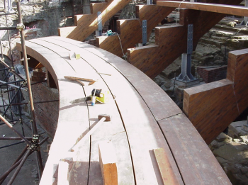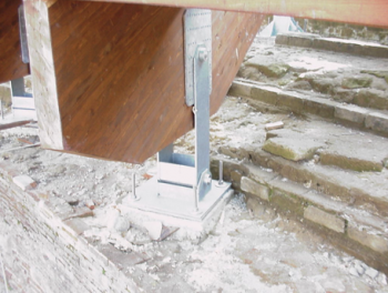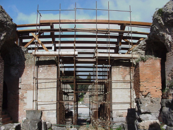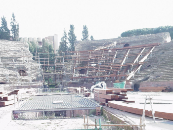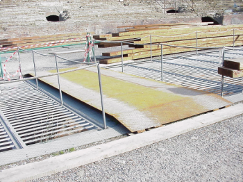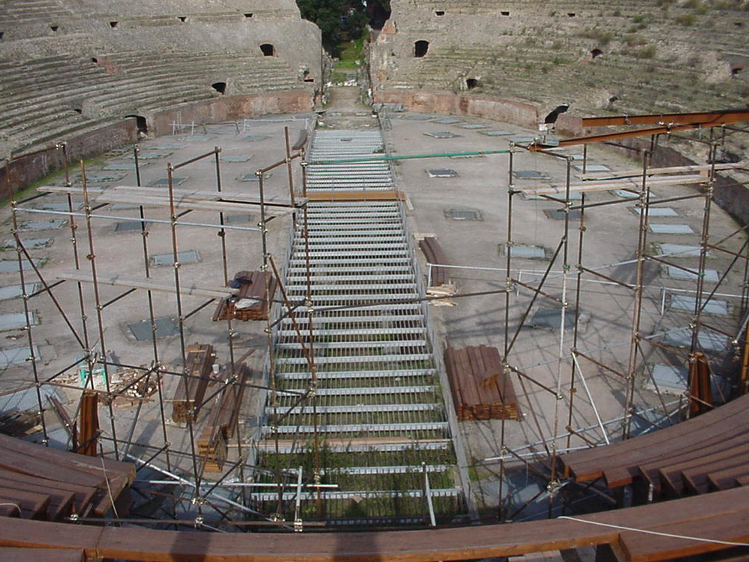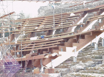 Il teatro è composto da una struttura principale costituita da travi in lamellare di larice (maggiore resistenza agli agenti atmosferici) sagomate a gradoni divise in due tronchi, e da una struttura secondaria costituita da travi in lamellare sagomate in modo da seguire l’andamento curvilineo della cavea e che costituisce le sedute. Le travi principali sono collegate alla muratura sottostante mediante dei pilastri in acciaio zincato, fissati con dei tiranti in acciaio AISI inghisati con malta di calce e pozzolana. A protezione della muratura è stato interposto tra la piastra di base e la cavea un foglio di neoprene. I pilastri sono stati posizionati in corrispondenza dei setti murari sottostanti la cavea, dopo un accurato rilievo topografico e numerosi saggi volti all’accertamento della consistenza di alcuni elementi strutturali.