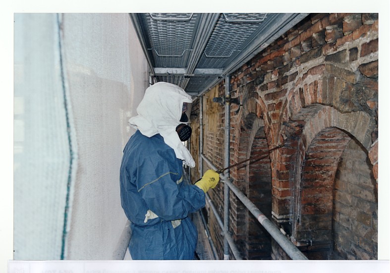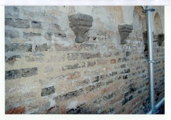 Restauro muratura in mattoni il restauro è stato eseguito attraverso diverse fasi: preconsolidamento delle parti in pietra con resina reversibile, rimozione di stuccature e intonaci dannosi, pulitura delle superfici, trattamento biocida per eliminare organismi biodegradanti, pulizia del laterizio da incrostazioni e ruggine, rimozione di sali solubili, consolidamento strutturale con resine e perni in acciaio inox, tassellature per parti mancanti, e rifacimento dei letti di malta con calce idraulica naturale e protettivo silossanico a dispersione acquosa.